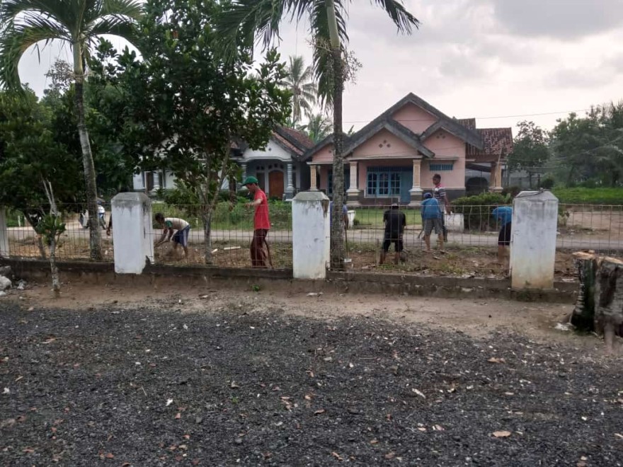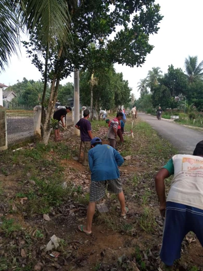 Sebagian aparatur ada yang membersihkan halaman depan balai kampung, dan sebagian ada yang membersihkan pinggir jalan sekitar balai kampung.