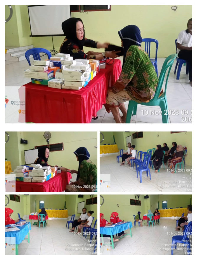 Dalam kegiatan ini sebagian besar pasien yang datang untuk berobat masih tetap ibu-ibu lansia dan ibu-ibu rumah tangga. Tujuan dari kegiatan ini ialah selain membantu para warga kampung Moris Jaya yang ingin berobat yaitu supaya bidan Desa Kampung Moris Jaya bisa selalu memantau kesehatan warga Kampung Moris Jaya khusus nya para lansia setiap minggu nyaagar bisa selalu terpantau kesehatan nya.Kegiatan ini di tangani langsung oleh bidan Desa Kampung Moris Jaya Ibu Devi Despalinda dan di bantu oleh para kader Kampung Moris Jaya.