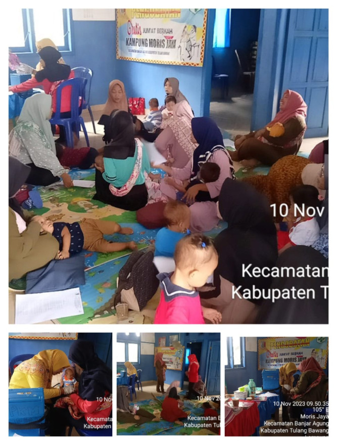 Dan bersamaan dengan itu para ibu kader Kampung Moris Jaya di bantu oleh tenaga kesehatan dari UPTD Tulang Bawang 01 melaksanakan kegiatan posyandu balita di gedung posyandu Kampung Moris Jaya.