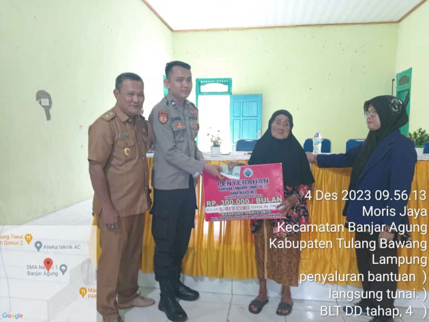 Senin, 04 Desember 2023 | Penyerahan BLT DD Tahap 4 di lakukan di Balai Kampung Moris Jaya dan dihadiri oleh Bapak Kepala Kampung Deska Hary Syanda, Sekretaris Kampung Bapak Sujono, Babhinkamptibnas Bapak Darfin Mustofa, dan Ibu Marchunaisih selaku Pendamping Desa tidak lupa di hadiri juga dari jajaran aparatur Kampung Moris Jaya.