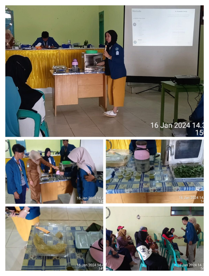 Setelah selesai Presentasi para Mahasiswa KKN dari UNILA memberikan contoh hasil pembuatan kue bolu yang menggunakan bahan dasar pengolahan tepung dari daun singkong lalu di berikan kepada peserta.