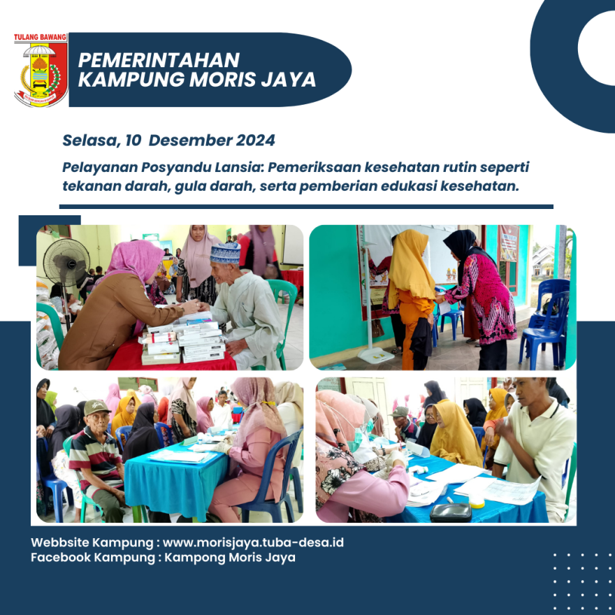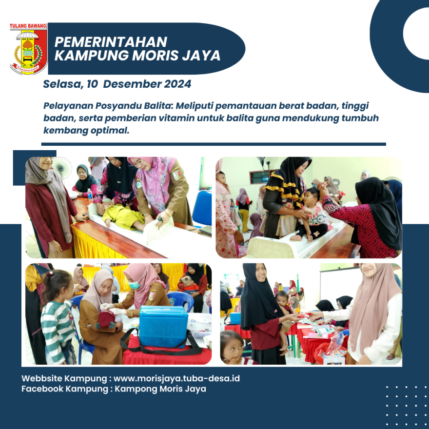 Pada Selasa, 10 Desember 2024, Kampung Moris Jaya kembali menggelar kegiatan Posyandu Terintegrasi yang bertempat di Balai Kampung Moris Jaya. Kegiatan ini dimulai pada pukul 09:00 WIB dan mencakup berbagai layanan kesehatan yang menyasar balita, lansia, serta ibu hamil.