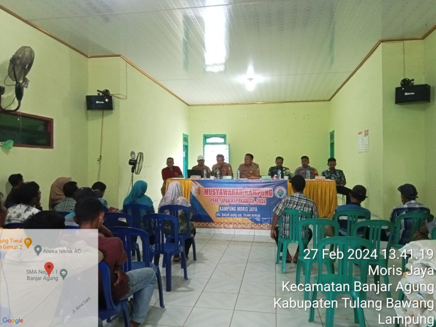 Selasa, 27 Februari 2024 | Telah dilaksanakan Musyawarah Kampung tentang Penetapan RAPBKAM Tahun 2024. Acara ini dihadiri oleh Camat Banjar Agung Bapak Sutikno,S.IP., M.IP, Kepala Kampung Moris Jaya Bapak Deska Hery Syanda, S.E, Babinsa Bapak Utoyo, Bhabinkamtibnas Bapak Buchori Hasyim, Ketua BPK Bapak Jono Rio dan lembaga desa lainnya.