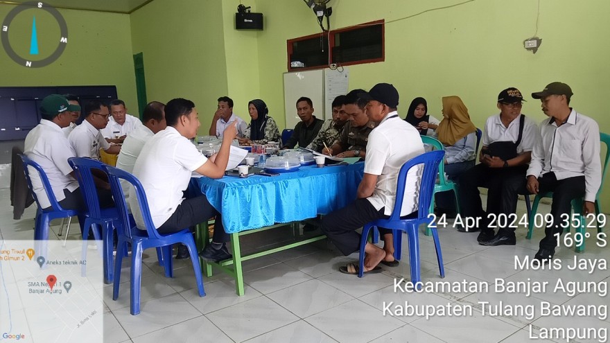 Rabu, 24 April 2024 | Dalam rangka tertib Administrasi Pemerintahan Kampung Moris Jaya, maka Tim Monitoring Pelaksanaan Pemerintahan dan Dana Desa Kecamatan Banjar Agung Kabupaten Tulang Bawang melaksanakan Monitoring dan Evaluasi pada hari ini dan dihadiri oleh Bapak Kepala Kampung Moris Jaya, Ketua dan Anggota BPK, Jajaran Pemerintahan Kampung Moris Jaya, Pendamping Desa, dan Tim Monitoring dari Kecamatan Banjar Agung.
