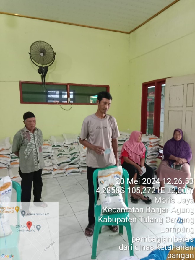 Senin, 20 Mei 2024 | Pemerintah Kampung Moris Jaya kembali melakukan penyaluran beras dari Dinas Ketahanan Pangan untuk warga Kampung Moris Jaya.