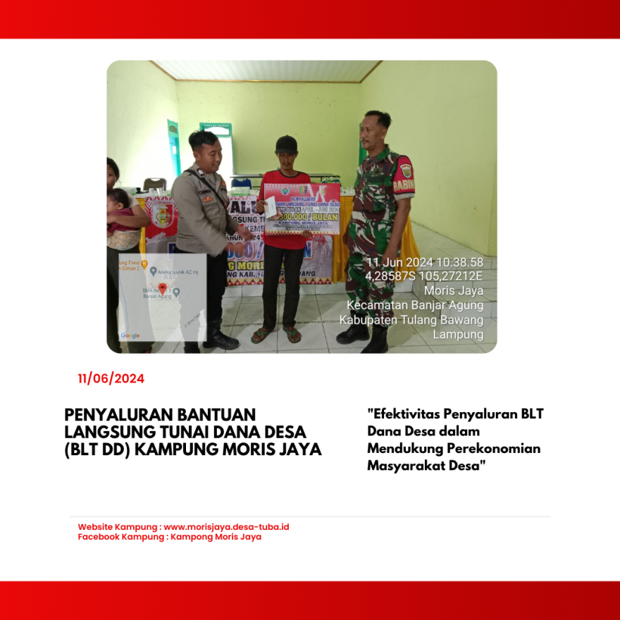 Selasa, 11 Juni 2024, Kampung Moris Jaya menggelar acara penyaluran Bantuan Langsung Tunai Dana Desa (BLT DD) kepada tujuh keluarga penerima manfaat (KPM). Acara ini berlangsung di Gedung Balai Kampung Moris Jaya dan dihadiri oleh berbagai pejabat serta aparatur pemerintahan desa.