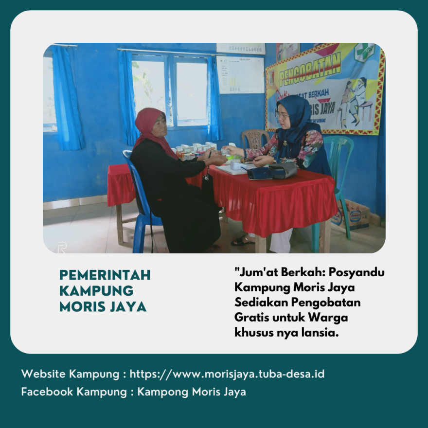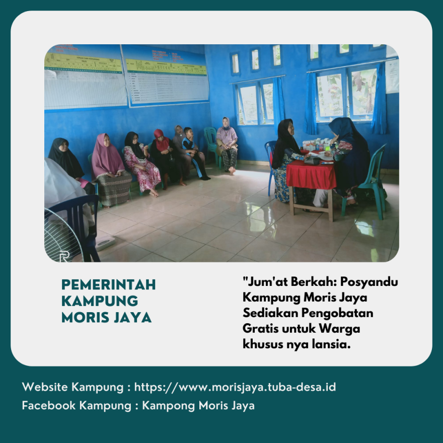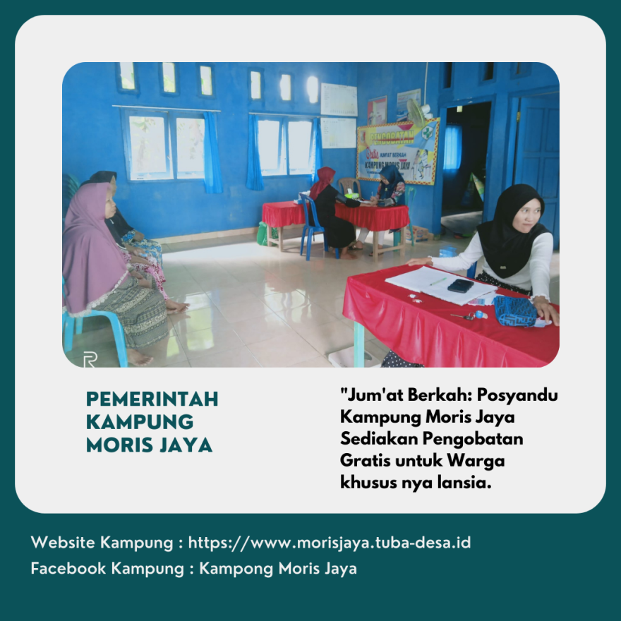 Jum'at, 07 Juni 2024 | Kegiatan Jum'at berkah pengobatan geratis yang dilaksanakan di gedung posyandu Kampung Moris Jaya. Gedung Posyandu di kampung tersebut menjadi pusat kegiatan yang sangat dinanti-nantikan oleh para warga, terutama para lansia. Mulai dari pukul 09:00 WIB, pintu posyandu dibuka untuk memberikan pelayanan pengobatan gratis kepada warga yang membutuhkan.