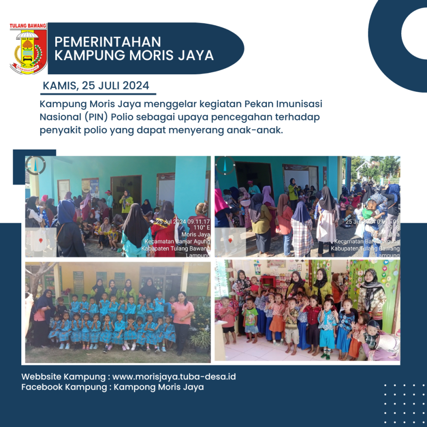 Kampung Moris Jaya, Kamis, 25 Juli 2024 – Hari ini, Kampung Moris Jaya menggelar kegiatan Pekan Imunisasi Nasional (PIN) Polio yang dimulai pukul 09:00 WIB dan berlangsung hingga selesai. Kegiatan ini diwajibkan bagi masyarakat yang memiliki anak berusia 0-7 tahun untuk hadir guna mengikuti imunisasi polio, sebagai upaya pencegahan terhadap penyakit polio yang dapat menyerang anak-anak.