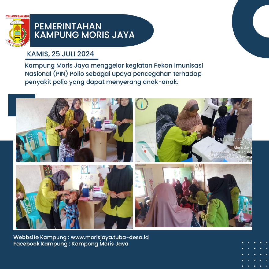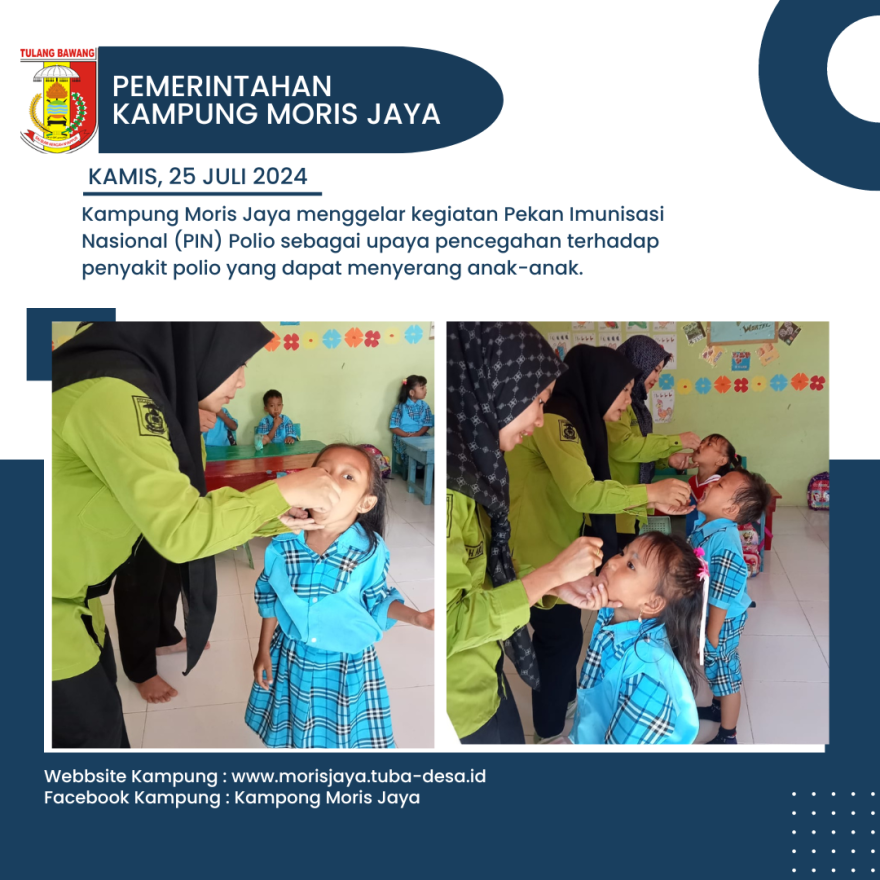 PIN Polio ini merupakan kolaborasi antara Pemerintahan Kampung Moris Jaya dengan UPTD Puskesmas Tulang Bawang 1. Kegiatan ini dipimpin langsung oleh Ibu Devi Despalinda Putri selaku Bidan Desa Kampung Moris Jaya, dibantu oleh para kader posyandu serta kawan-kawan dari UPTD Puskesmas Tulang Bawang 1. Selain itu, kegiatan ini juga dihadiri oleh Bapak Deska Hery Syanda, S.E selaku Kepala Kampung Moris Jaya yang didampingi oleh Sekretaris Kampung Bapak Sujono.