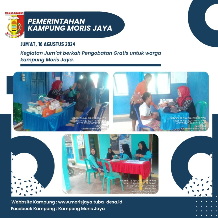 Acara ini juga bertepatan dengan pelaksanaan Jum'at Berkah berupa pengobatan gratis bagi masyarakat. Kegiatan ini dimulai tepat pada pukul 08:00 WIB dan berlangsung hingga selesai. Ibu Devi Despalinda Putri, selaku Bidan Desa Kampung Moris Jaya, memimpin pelaksanaan kegiatan ini dengan bantuan para kader desa yang berkomitmen untuk memberikan pelayanan kesehatan terbaik kepada warga.
