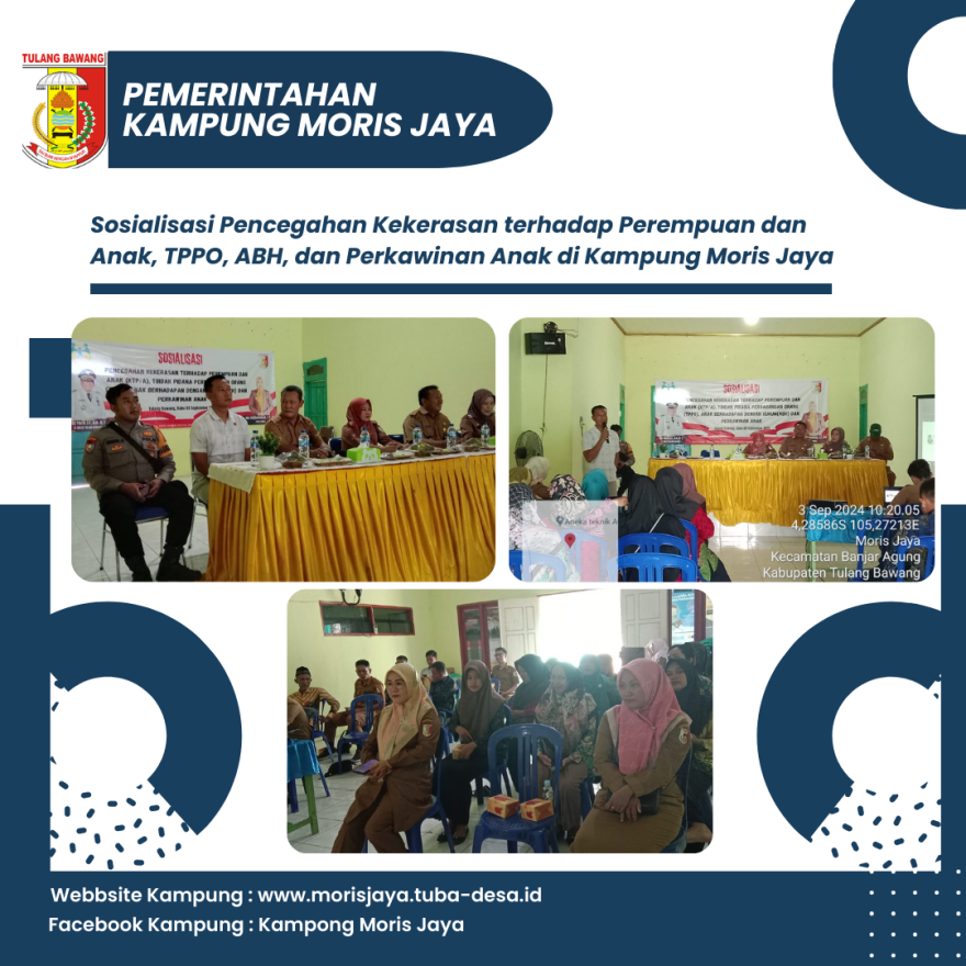 Pada hari ini, Selasa, 3 September 2024, diadakan acara sosialisasi yang sangat penting di Gedung Balai Kampung Moris Jaya. Acara ini membahas topik-topik krusial terkait Pencegahan Kekerasan terhadap Perempuan dan Anak (KTP/A), Tindak Pidana Perdagangan Orang (TPPO), Anak Berhadapan dengan Hukum (ABH), serta Perkawinan Anak. Kegiatan ini dimulai tepat pada pukul 09:00 WIB dan dihadiri oleh berbagai pihak yang memiliki peran signifikan dalam bidang ini.