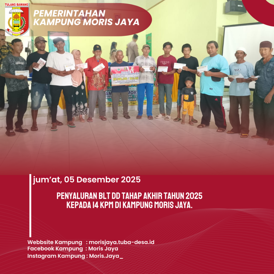 Pada hari Jum’at, 05 Desember 2025, Pemerintahan Kampung Moris Jaya kembali melaksanakan kegiatan penyaluran Bantuan Langsung Tunai Dana Desa (BLT DD) Tahun Anggaran 2025. Kegiatan ini berlangsung di Gedung Balai Kampung Moris Jaya dan berjalan dengan tertib serta lancar.