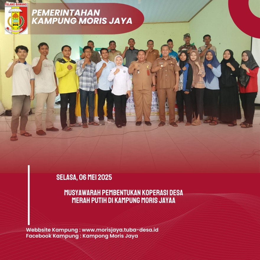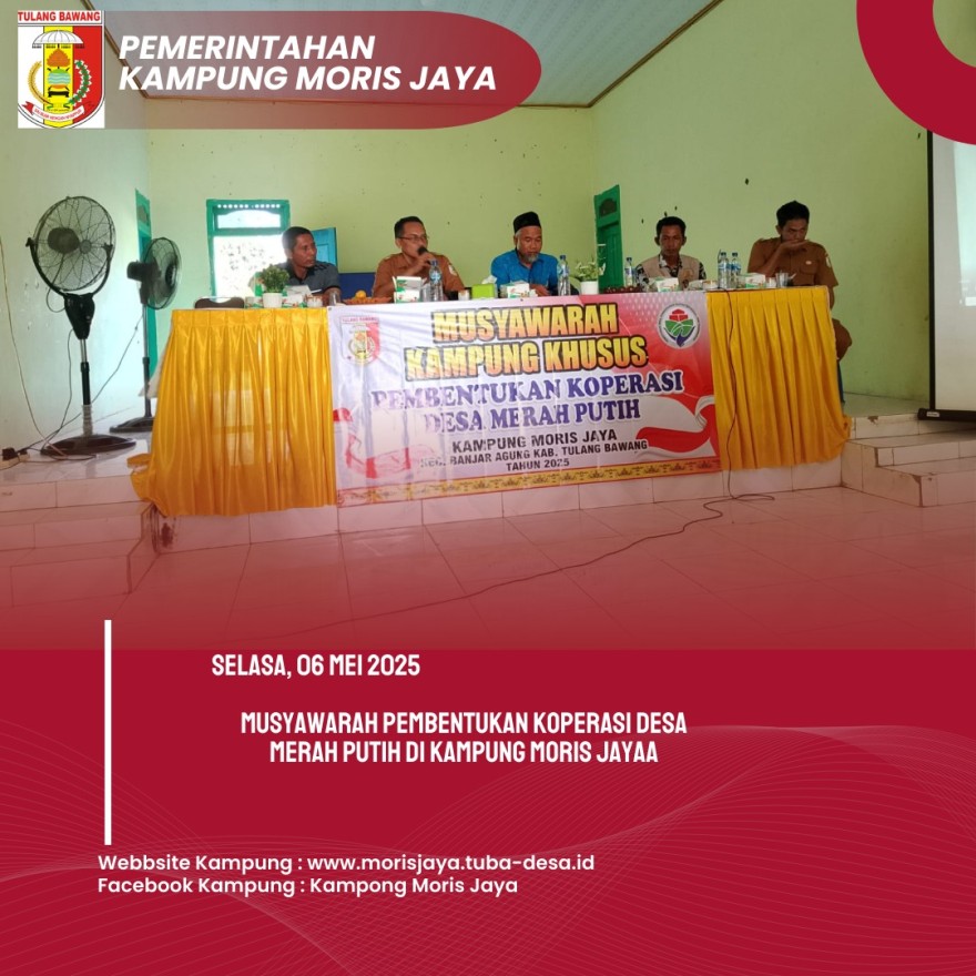 Pada Selasa, 6 Mei 2025, Kampung Moris Jaya menggelar Musyawarah Desa Khusus (Musdesus) di Balai Kampung Moris Jaya mulai pukul 13.00 WIB. Acara ini dihadiri oleh Bapak Kepala Kampung Moris Jaya, Bapak Camat Banjar Agung, Babinkamtibnas, Babinsa, pendamping desa, ketua RT/RW, serta para calon anggota Koperasi Desa Merah Putih.