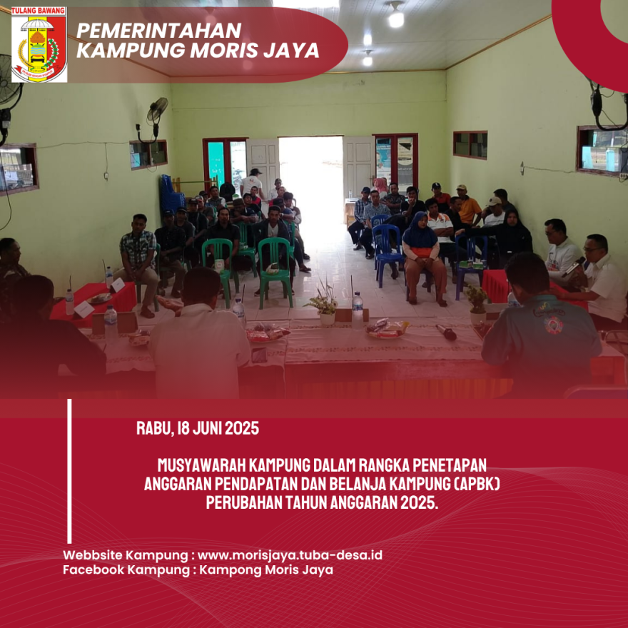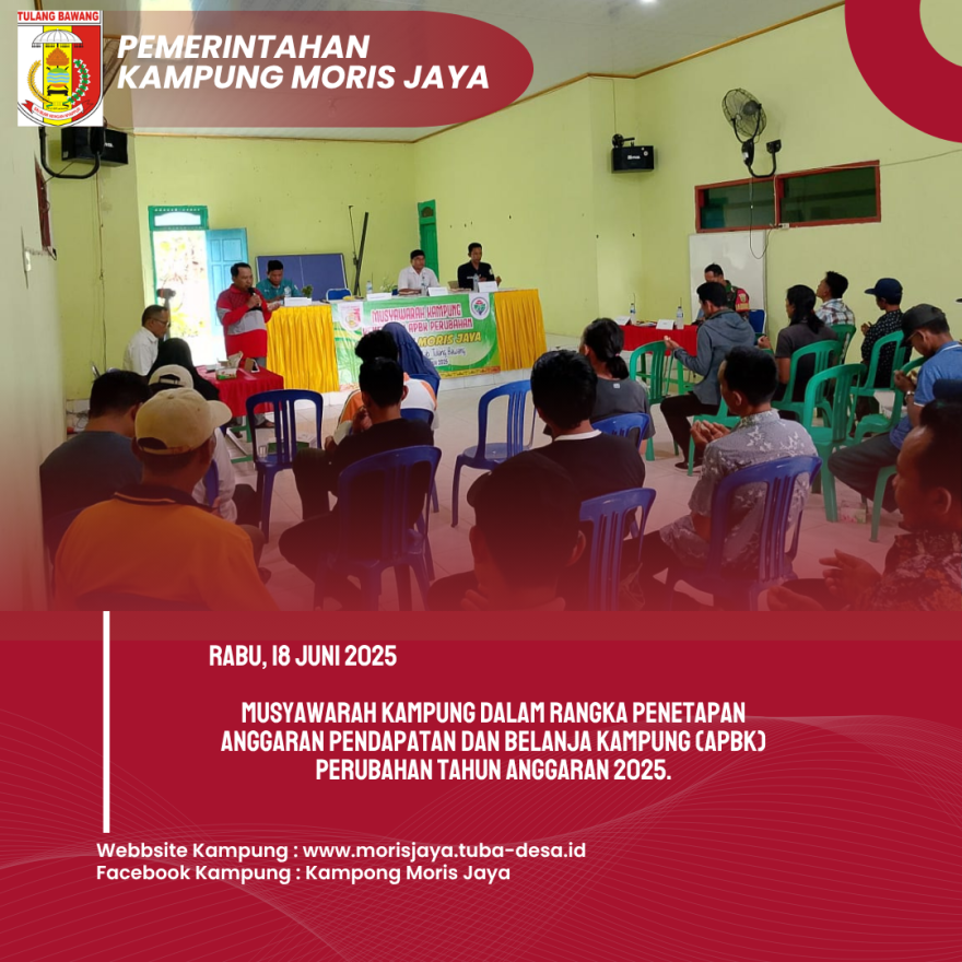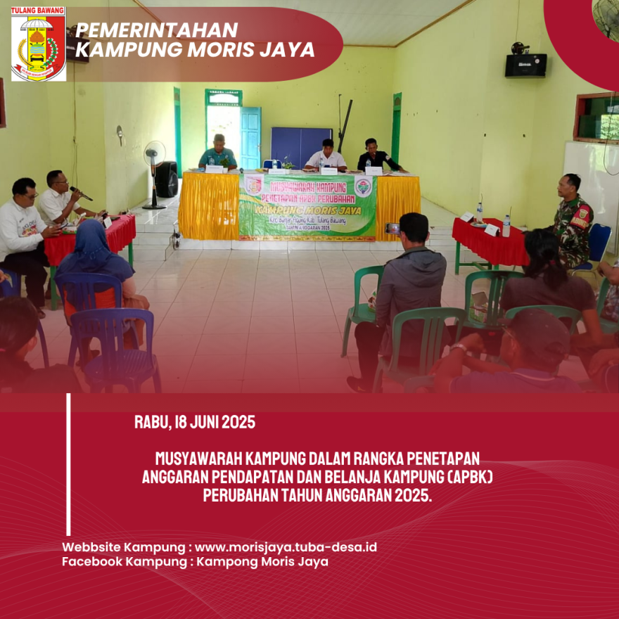 Moris Jaya, 18 Juni 2025 – Pemerintah Kampung Moris Jaya, Kecamatan Banjar Agung, Kabupaten Tulang Bawang, melaksanakan Musyawarah Kampung dalam rangka Penetapan Anggaran Pendapatan dan Belanja Kampung (APBK) Perubahan Tahun Anggaran 2025. Kegiatan ini berlangsung pada hari Rabu, 18 Juni 2025, pukul 13.00 WIB, bertempat di Balai Kampung Moris Jaya.