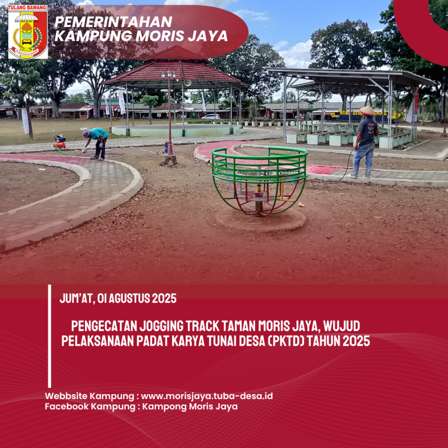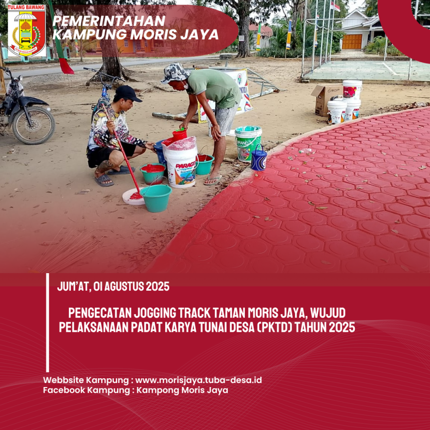 Jum’at, 01 Agustus 2025 – Pemerintah Kampung Moris Jaya memulai kegiatan pengecatan jogging track di area Taman Kampung Moris Jaya sebagai bagian dari program Padat Karya Tunai Desa (PKTD) yang didanai oleh Dana Desa Tahun Anggaran 2025.
