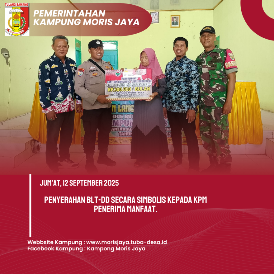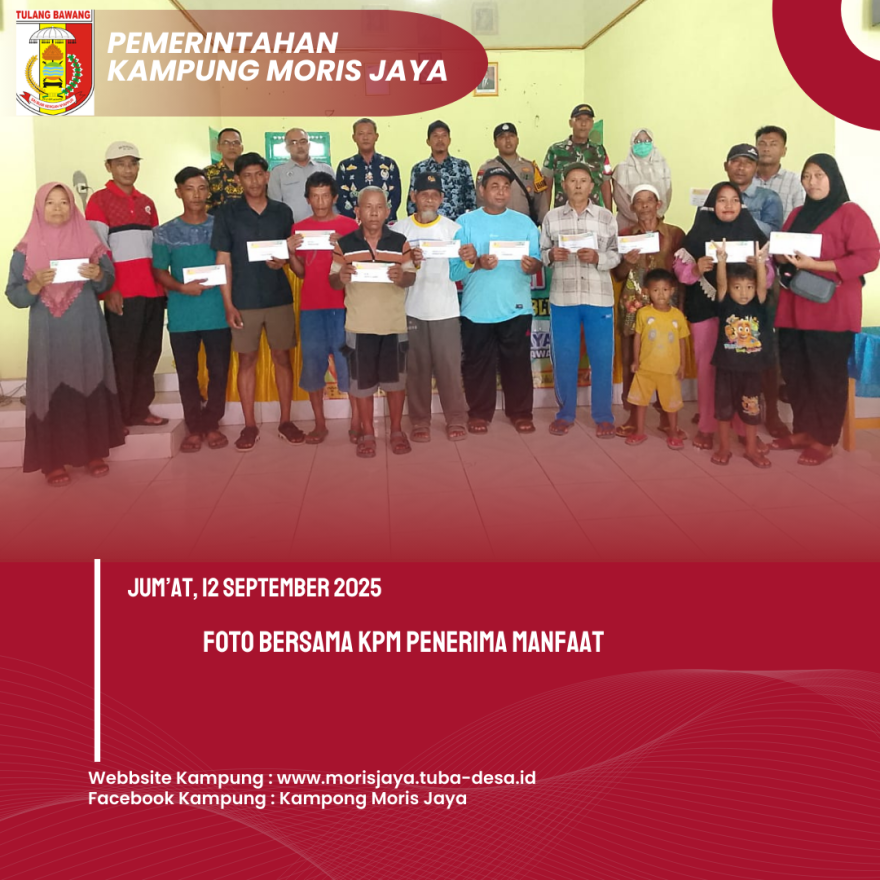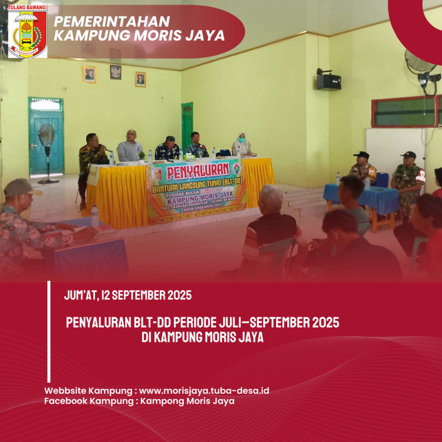 Jum’at, 12 September 2025, Kampung Moris Jaya kembali menyalurkan Bantuan Langsung Tunai Dana Desa (BLT-DD) untuk periode bulan Juli hingga September Tahun 2025. Kegiatan ini dilaksanakan di Gedung Balai Kampung Moris Jaya dan berlangsung mulai pukul 09:00 WIB hingga selesai.