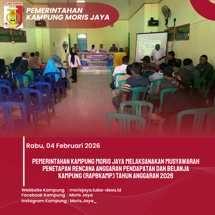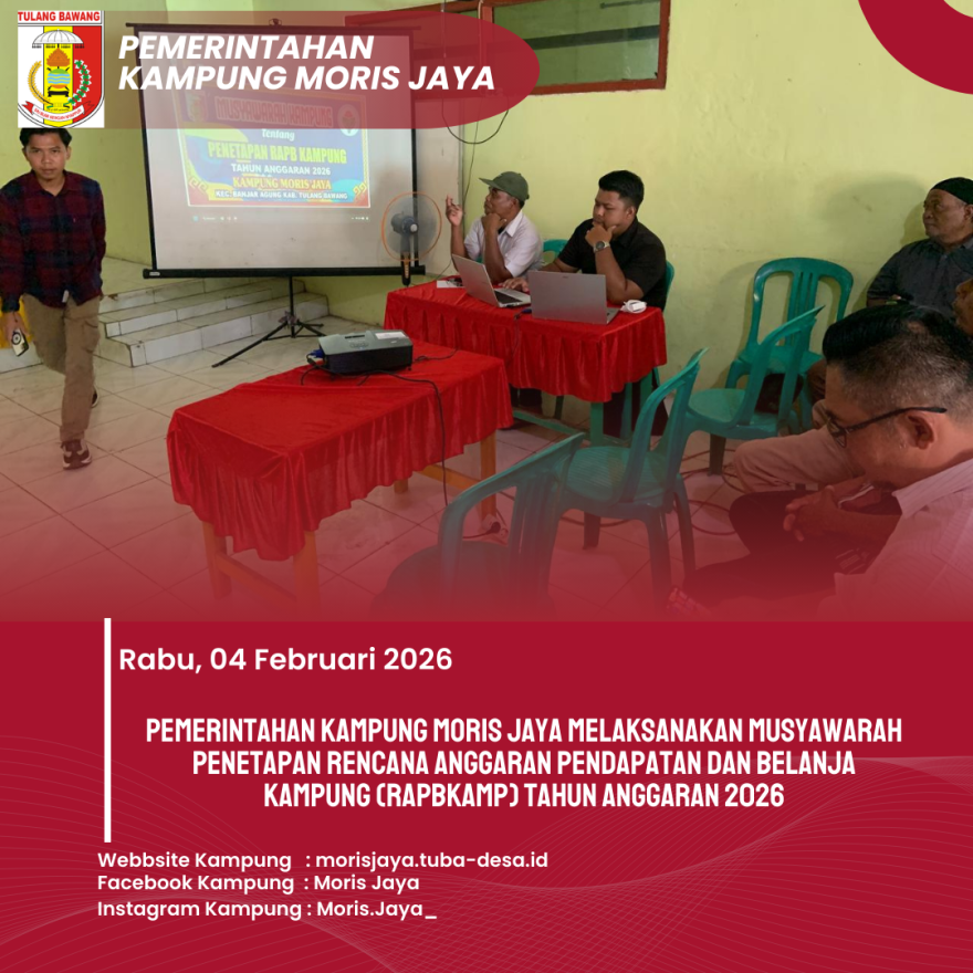 Pemerintahan Kampung Moris Jaya melaksanakan Musyawarah Penetapan Rencana Anggaran Pendapatan dan Belanja Kampung (RAPBKamp) Tahun Anggaran 2026 sekaligus Penetapan Keluarga Penerima Manfaat (KPM) Bantuan Langsung Tunai Dana Desa (BLT DD) Tahun Anggaran 2026, pada Rabu, 04 Februari 2026.